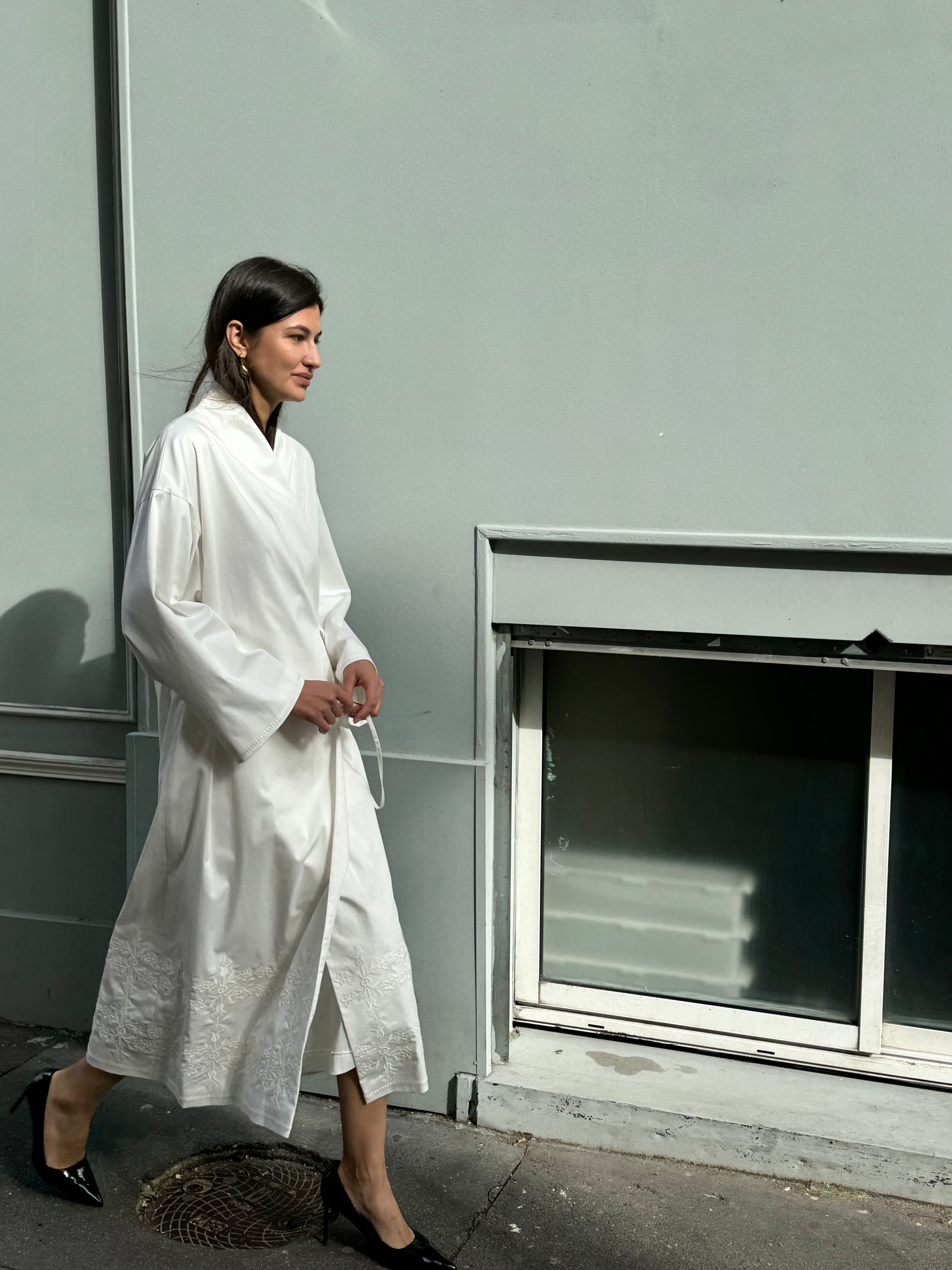Kimono in a milky color of structured fabric, made on the scent with an architectural collar and a unique ornament embroidered with voluminous threads, created especially for the SS25 collection. The product is fixed at the waist with the help of ropes, which allows you to adjust the volume or create the desired layering.